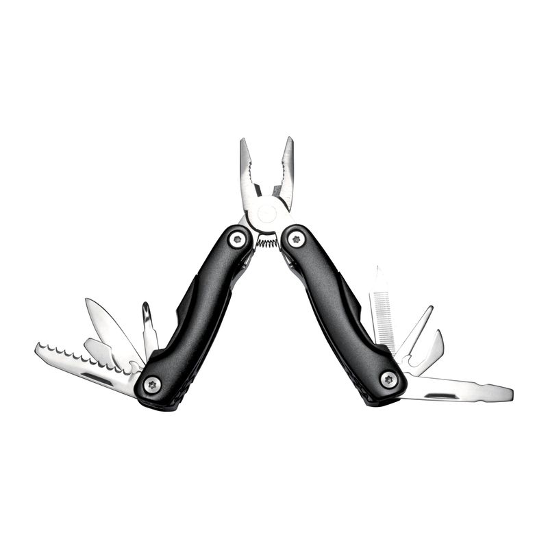 Компактен и функционален комплект, състоящ се от алуминиево фенерче с 9 светодиода и мултифункционален инструмент със здрав метален корпус и ергономичен дизайн, включващ клещи, пила за нокти, отварачка за консерви, отвертка Phillips и две различни отвертки с шлиц, нож, нож с назъбен край, отварачка за бутилки и др.