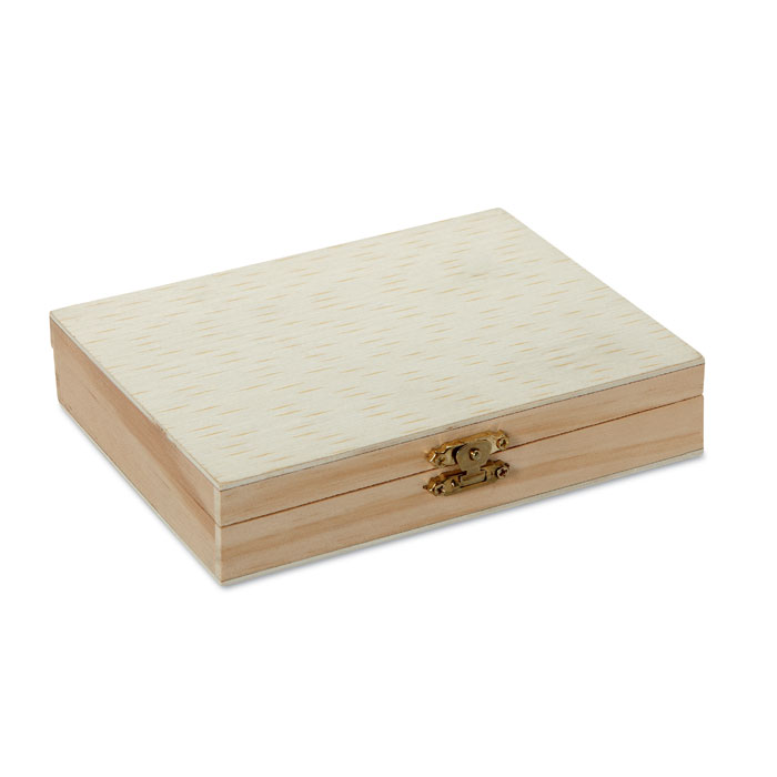 Кутията е изработена от дърво, което осигурява здравина и е удобна за съхранение на всички материали.