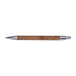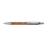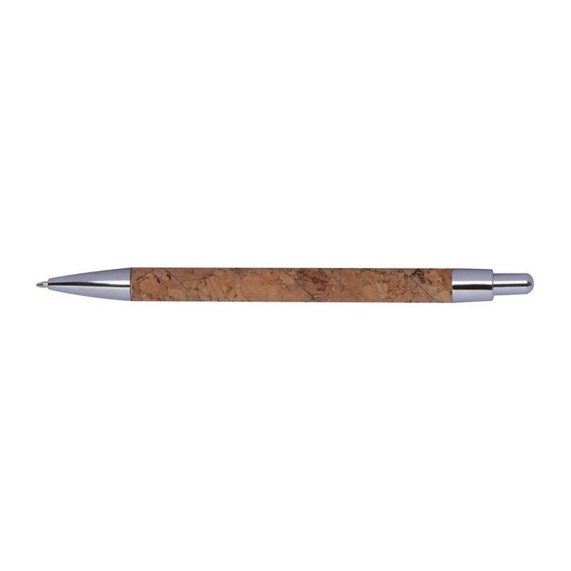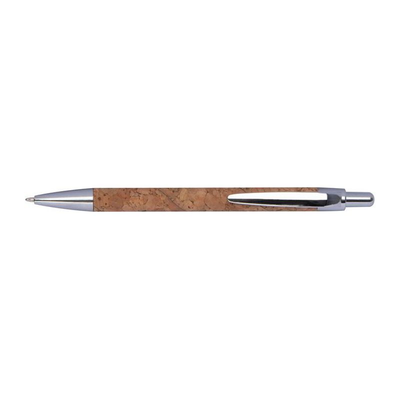 Прибираща се химикалка с коркова цев и елегантни сребърни апликации, със син пълнител за писане.
