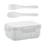 Двуетажна PP кутия за обяд с подходящи прибори и удобна дръжка за лесно пренасяне.