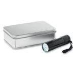 9 LED алуминиева фенерче. Доставя се с 3xAAA батерии и подвижна каишка. Предлага се в тенекиена кутия.