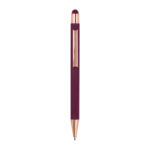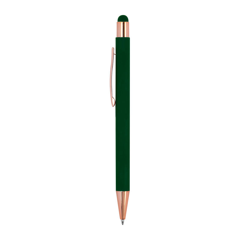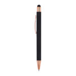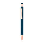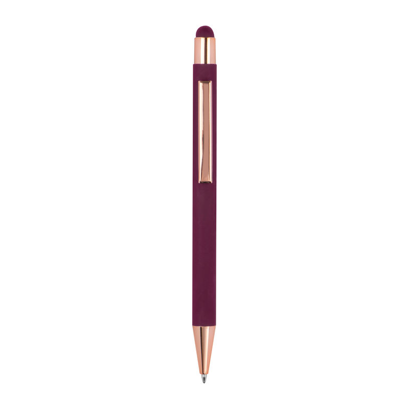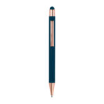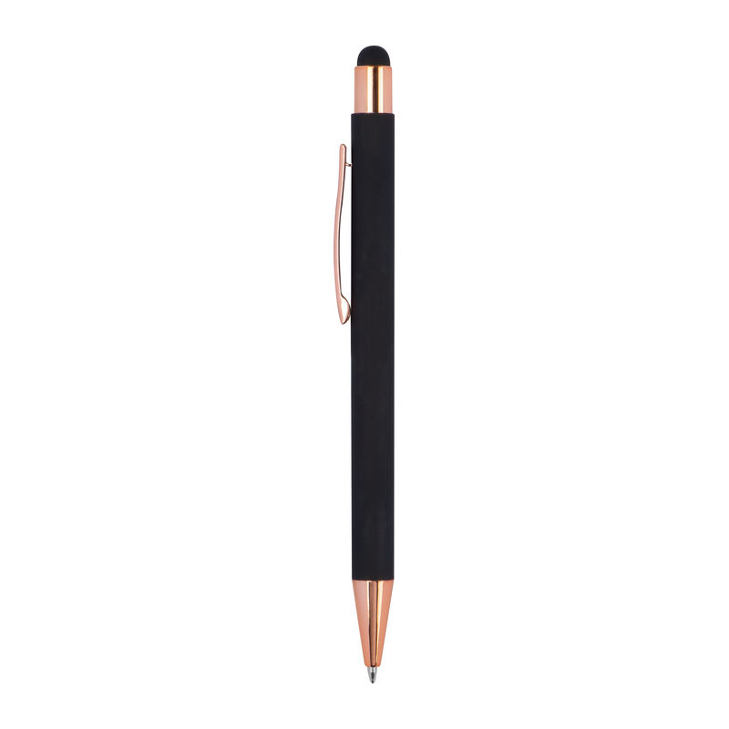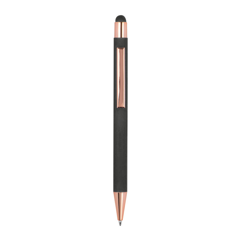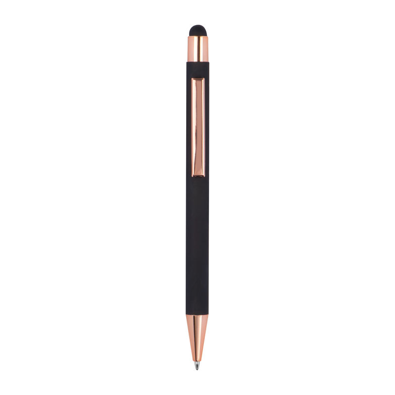 Метална химикалка с мека на допир повърхност и апликации от розово злато. Снабден с пълнител и синьо мастило.