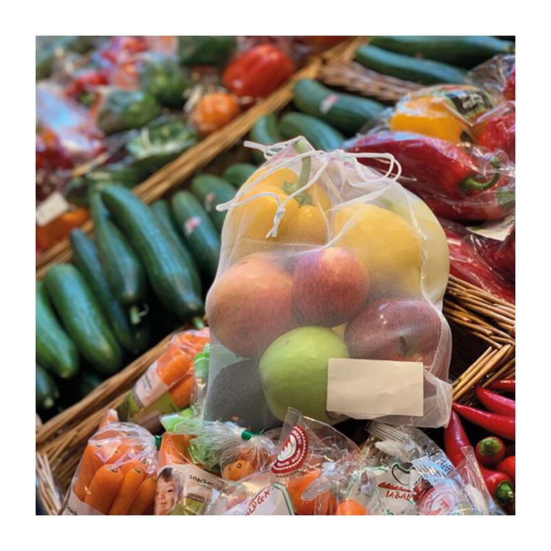Екологична, миеща се и издръжлива мрежа от полиестер, идеална за пазаруване на плодове и зеленчуци.