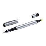 Алуминиева химикалка с черен пълнител и жълт хайлайтър от другата страна.