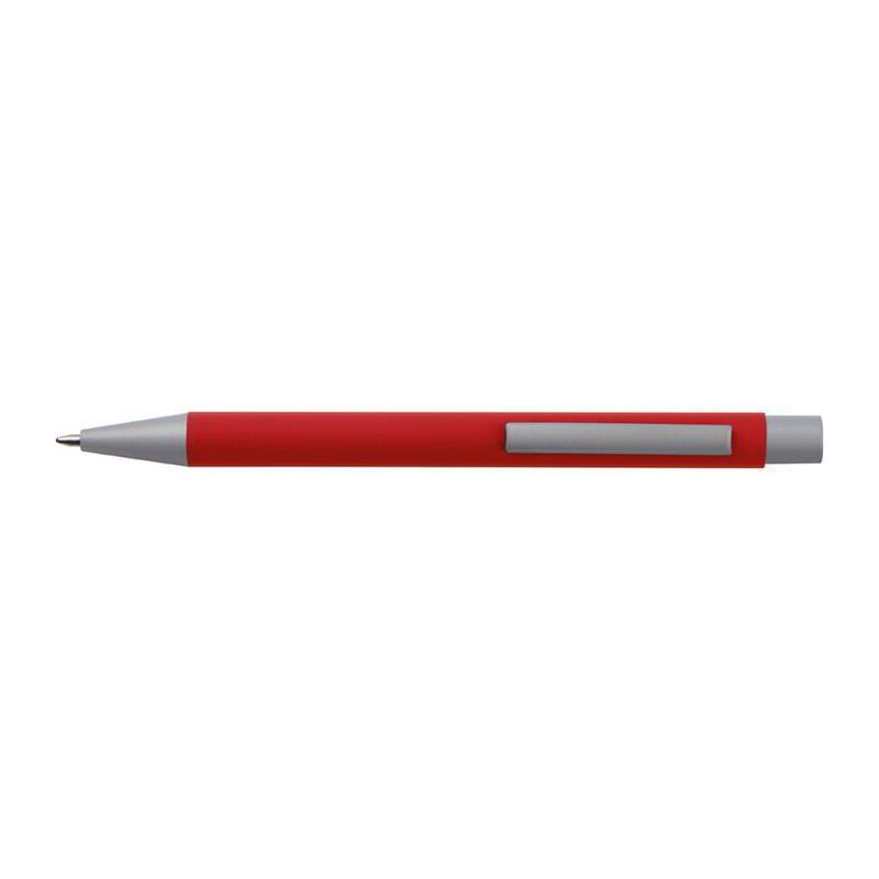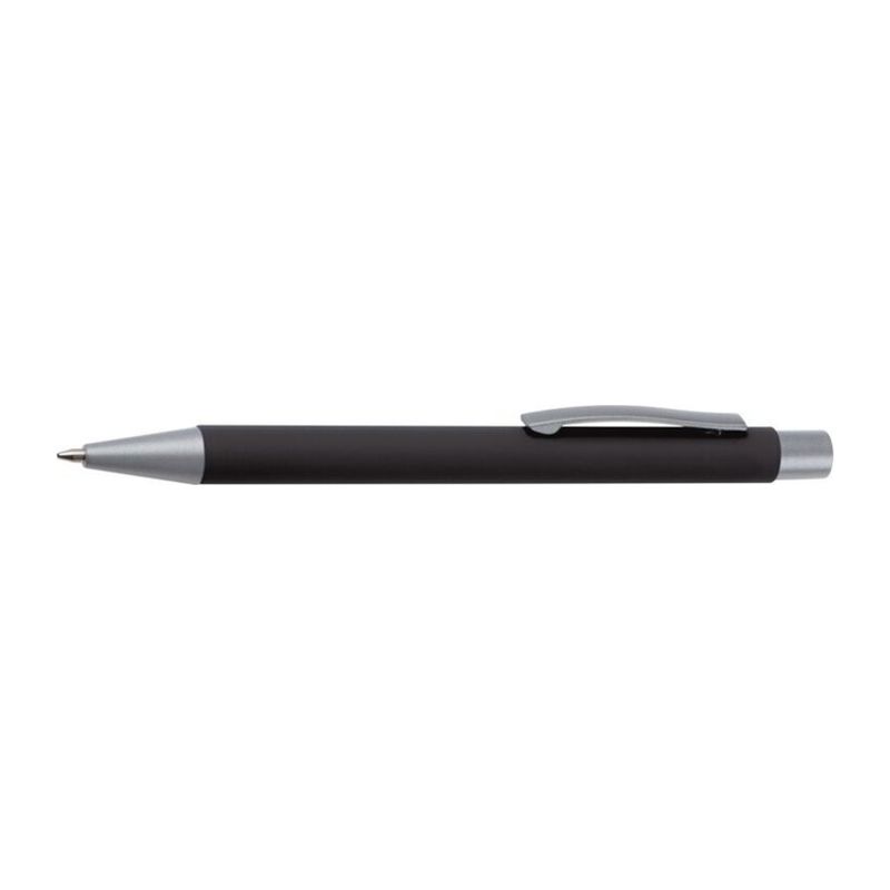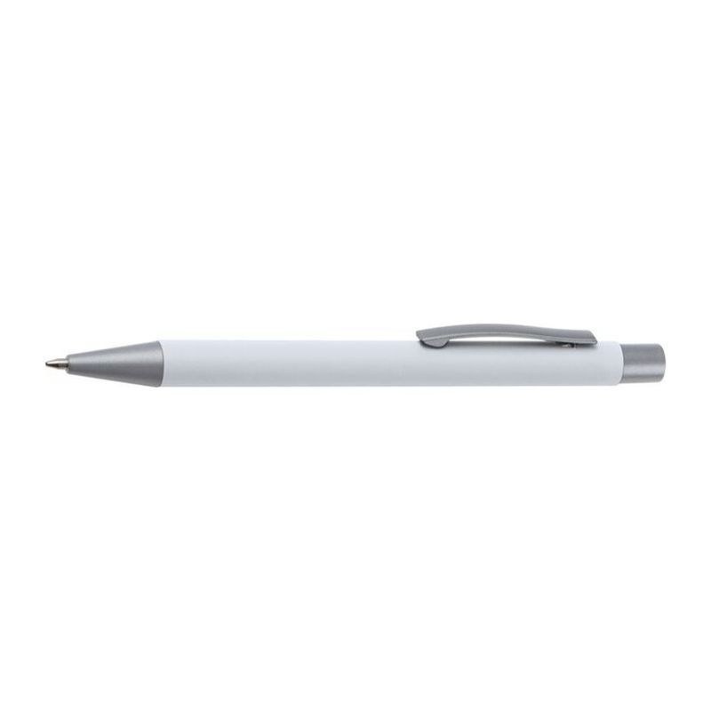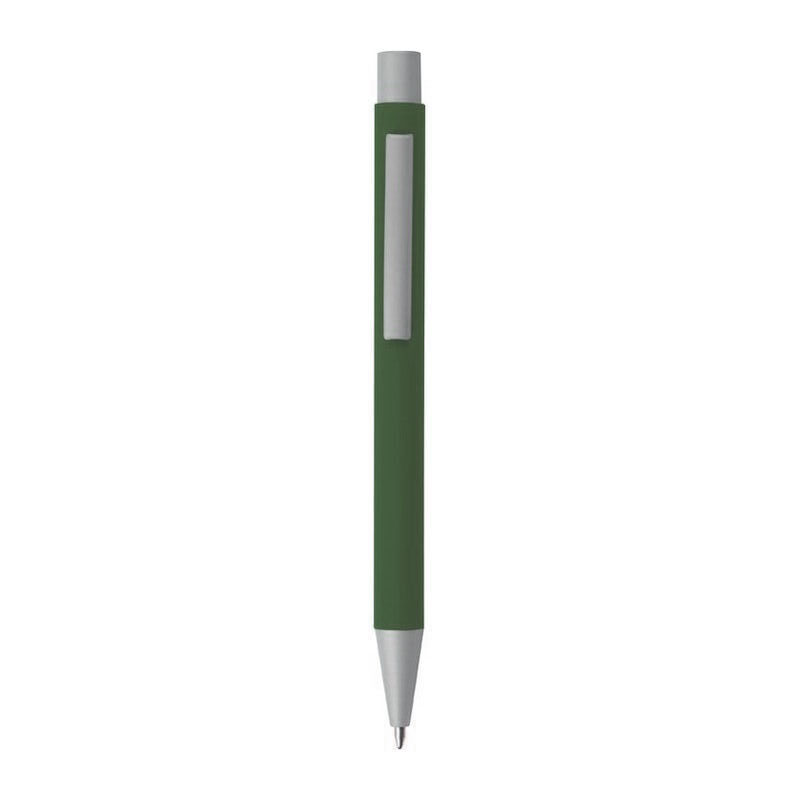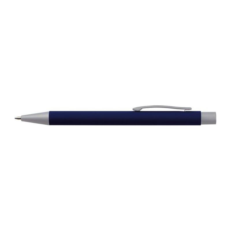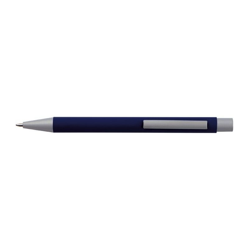 Гумирана метална химикалка в цветове по избор и син пълнител за писане.