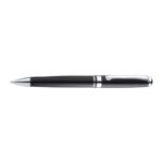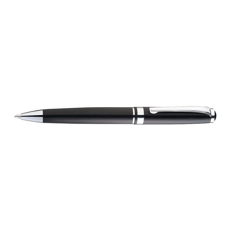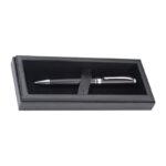 Висококачествена метална химикалка в черен мат с лъскави сребристи апликации, опакована в елегантна подаръчна кутия.