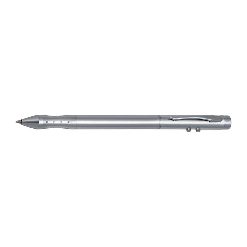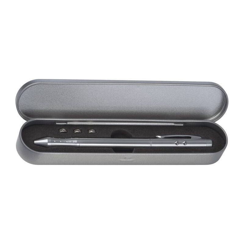 4в1 лазерна химикалка. Метална химикалка с червени и сини пълнители за писане, лазерна показалка и LED. Опакован в метална кутия, включва три клетъчни батерии тип бутон.