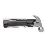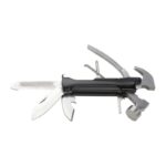 Многофункционален инструмент с две остриета, пила, трион, права отвертка и отварачка за бутилки, който също така е напълно функционален чук.