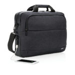 Модна 15” чанта за лаптоп от двуцветен полиестер с PU. Проектиран с едно голямо основно отделение за вашия лаптоп и едно предно отделение. Свържете вашата Powerbank лесно към интегрирания USB порт за зареждане и зареждайте телефона или таблета си в движение. С презрамка и презрамка за количка на гърба.