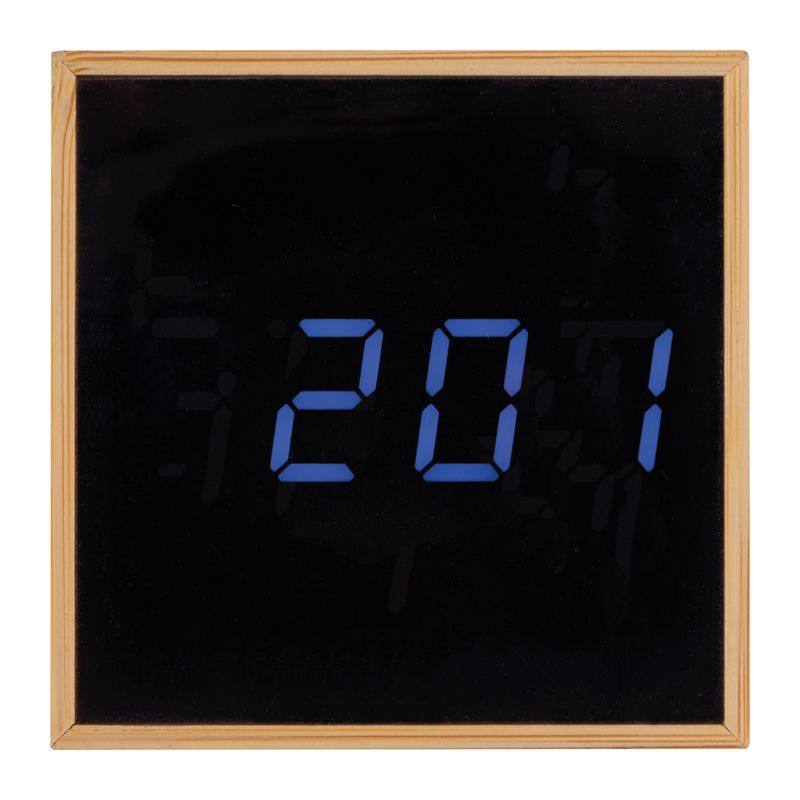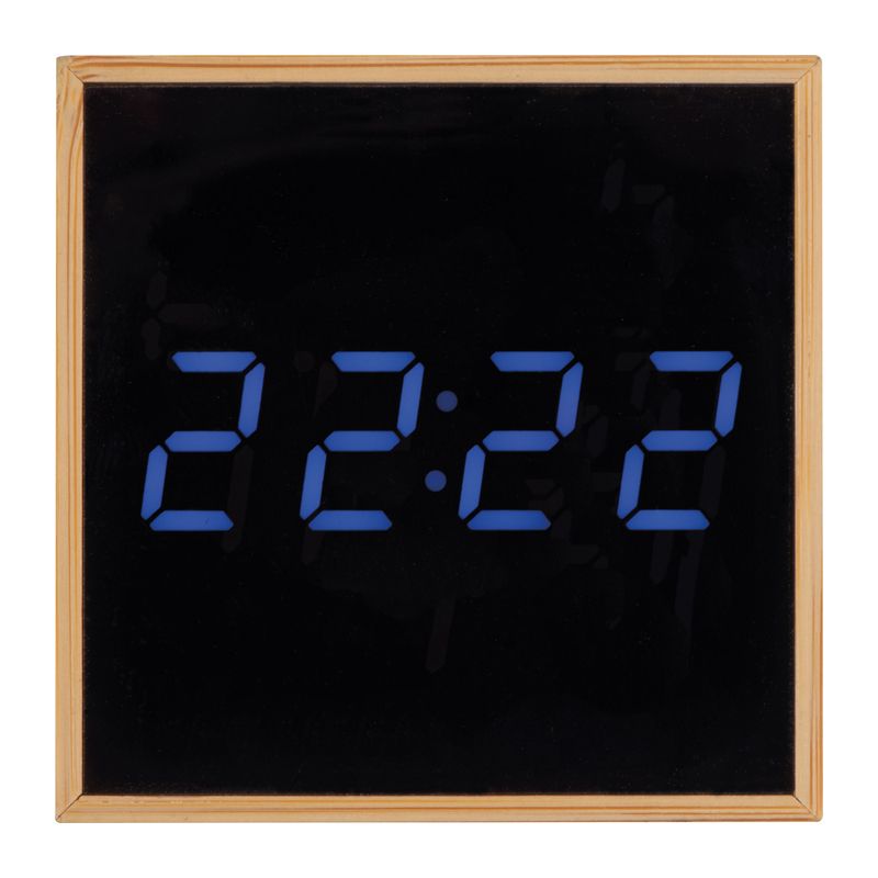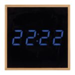 Елегантен настолен часовник с дървено покритие, черно пространство на дисплея и сменящ се син LED дисплей с букви, показващ час, дата и температура.