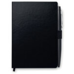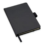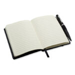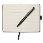Тефтер А6 с химикал. Твърдо PU покритие. Каса. 144 редовани страници (72 листа). Подходяща еластична лента за затваряне, панделка за отметка и държач за химикал. Подходяща химикалка с метален бутон. Синьо мастило.