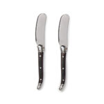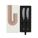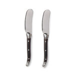 Ексклузивен комплект ножове за масло от неръждаема стомана от 2 части. Тези ножове са идеални за намазване на масло или конфитюр върху препечен хляб, гевреци, мъфини и други. Висококачествените остриета от неръждаема стомана осигуряват плавно разнасяне без усилие, докато здравите дръжки от дърво pakka осигуряват удобен захват. Комплектът се предлага опакован в изключителна подаръчна кутия, което го прави идеален подарък за всеки повод.