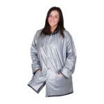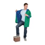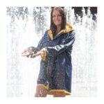 Останете сухи в дъжда! Обръщащ се дъждобран с качулка, 2 джоба и копчета. Предлага се в сребристо/черно, синьо/зелено и жълто/синьо.