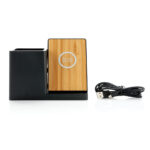 10 W бързо безжично зарядно устройство с държач за писалка, направено с RCS (Recycled Claim Standard) сертифициран рециклиран ABS. Общо рециклирано съдържание: 78% въз основа на общото тегло на артикула. RCS сертификацията гарантира напълно сертифицирана верига за доставки на рециклирани материали. Бамбукова зона за безжично зареждане, изработена от бамбук FSC 100. С два USB порта на гърба за зареждане чрез кабел. Безжично зареждане, съвместимо с последните поколения Android, iPhone 8 и по-нови. Артикули и аксесоари без PVC. Включително 120 cm тип C кабел за зареждане, изработен от RCS сертифициран рециклиран TPE. Опаковани в FSC смесена крафт кутия. Тип-C вход 5V/2A; 9V/2A; Безжичен изход 5V/1A;9V/1.1A; (10W) Регистриран дизайн®