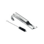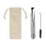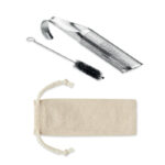 Комплект за многократна употреба за настойка за чай от неръждаема стомана в памучна торбичка. Включва филтър за чай с компактна и извита кука, за да може да виси над ръба на чашата или халбата и четка за почистване.