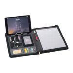 Папка А4, изработена от лепена кожа, включваща външна батерия (капацитет 5000 mAh), USB-кабел, 8 джоба, джоб за мобилен телефон, халка за химикал, джоб за таблет и бележник.