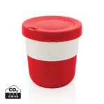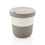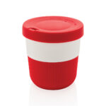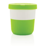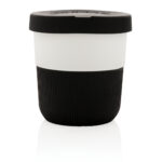 Устойчива алтернатива на традиционните чаши! Внасяйки стил и практичност във вашето сутрешно пътуване, тази термочаша за кафе PLA е идеална за транспортиране на любимата ви топла напитка. Произведен от растителен материал (PLA), така че не само стилен, но и мил за планетата. Предлага се със силиконова дръжка и капак за ваше удобство. Пасва удобно под повечето кафемашини. 100% без меламин. Вместимост 280мл.