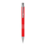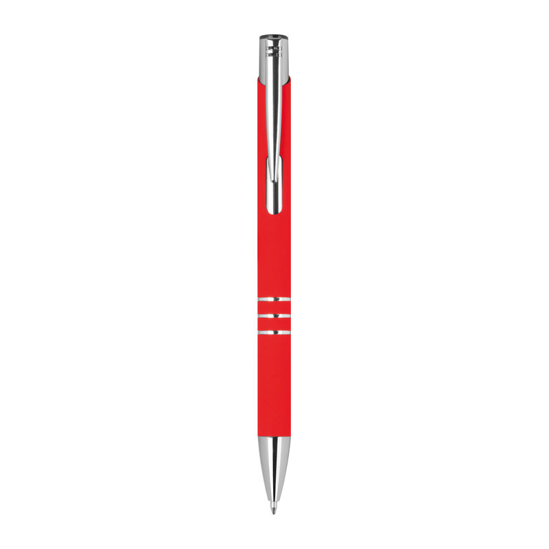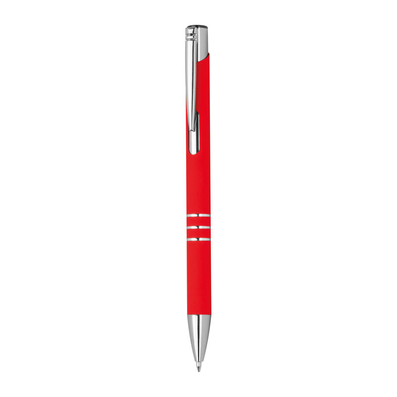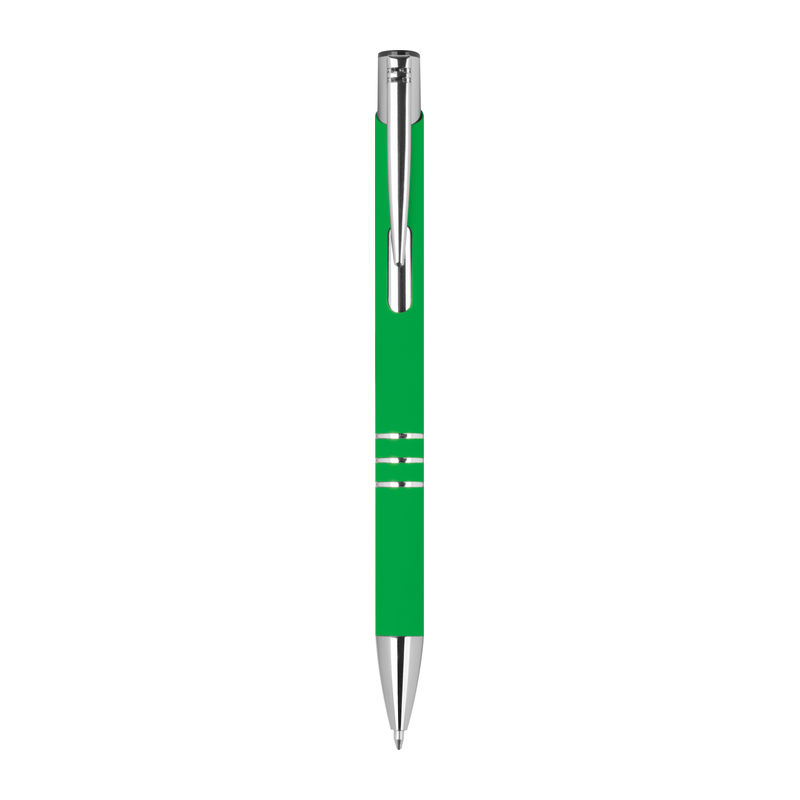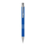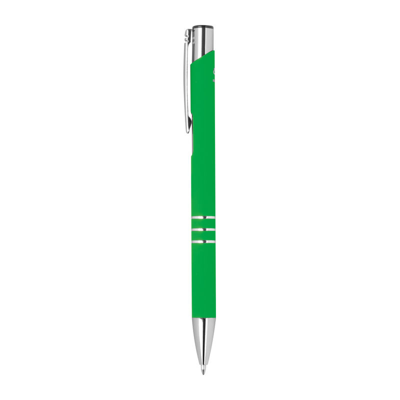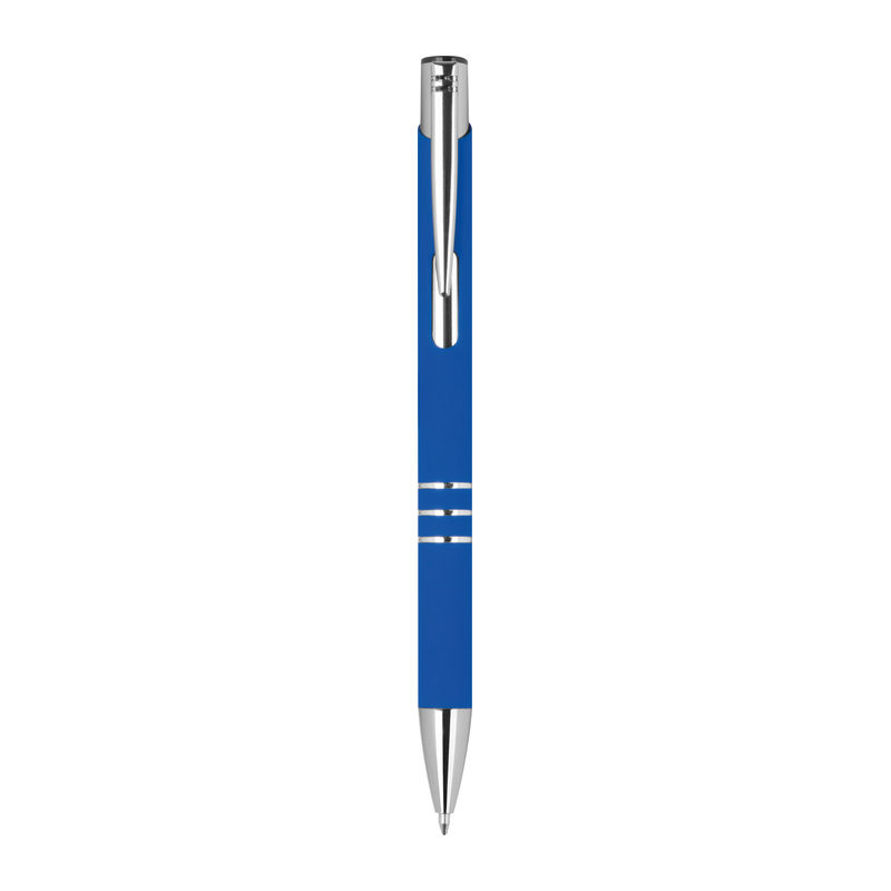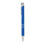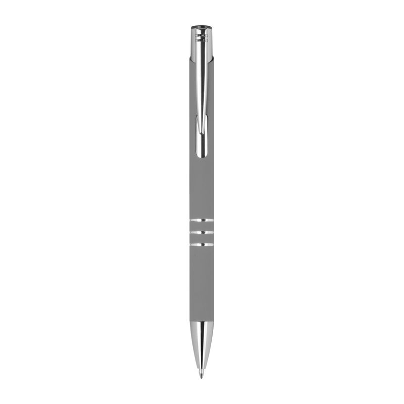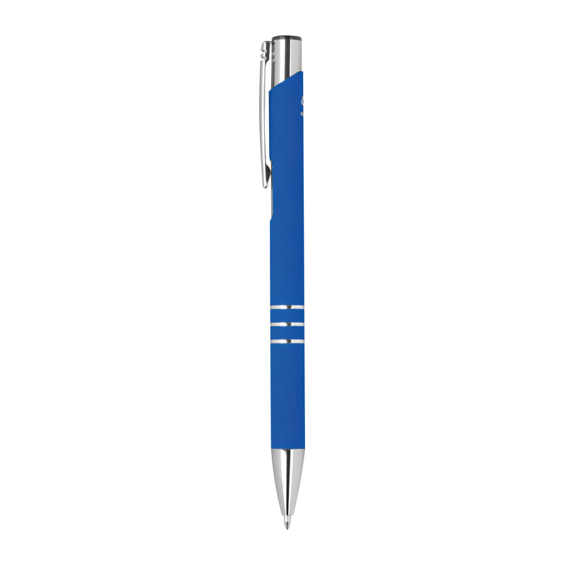 Полугел химикалка от рециклиран алуминий с гумирана повърхност и три декоративни ринга. С пълнител с голяма вместимост със син надпис (полу-гел 0,7 mm връх).