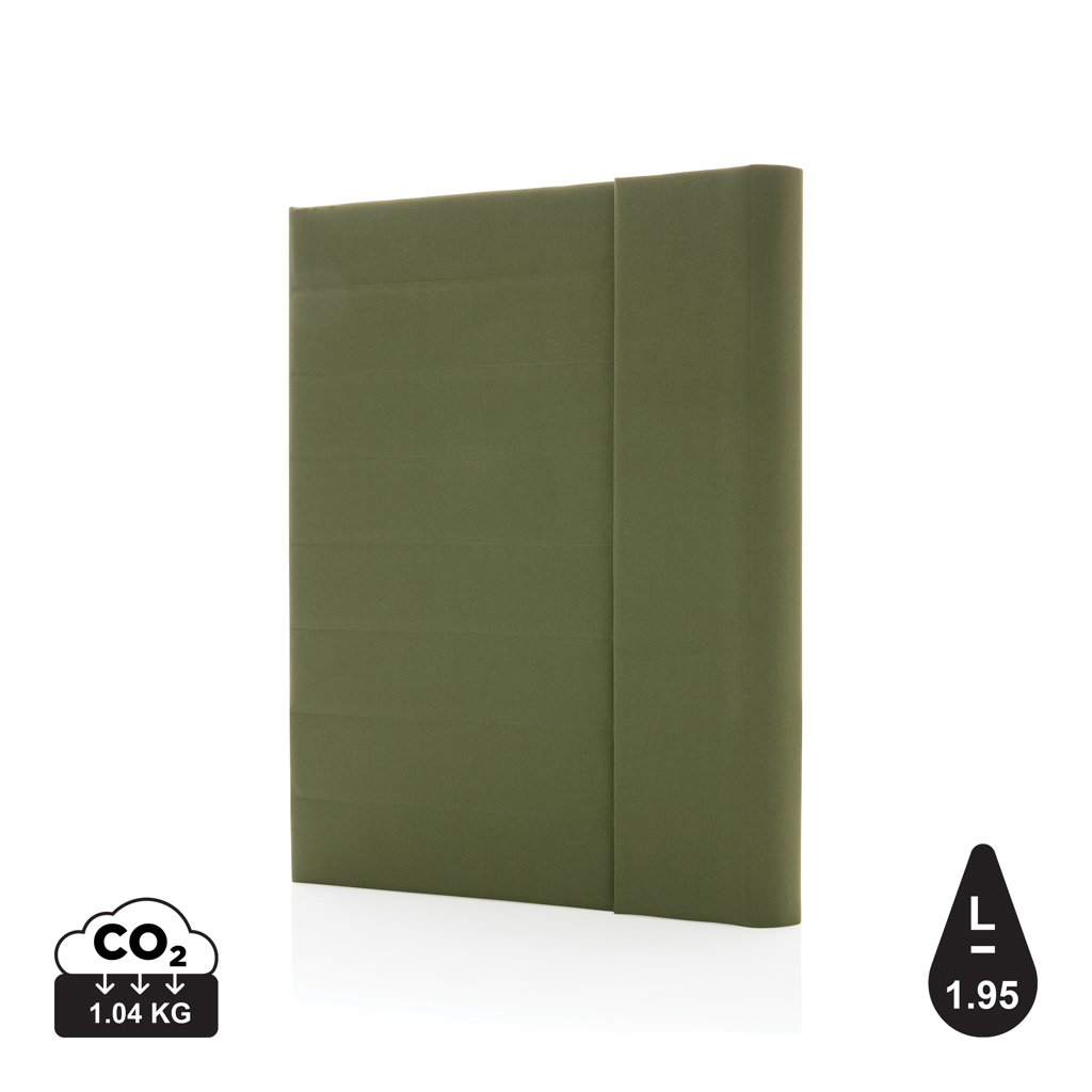 Поддържайте организирани всичките си основни работни неща с това красиво портфолио A4 Aware™ RPET с магнитно затваряне. Вътре ще намерите 1 голям джоб на ръкава, 2 допълнителни джоба и халка за химикал. Включително FSC бележник от рециклирана хартия. Бележникът съдържа 20 листа рециклирана хартия в кремав цвят 70 gm/s. Интериор и екстериор 100% рециклиран полиестер. С индикатор AWARE™, който потвърждава истинското използване на рециклирани материали. Всяко портфолио спестява 1,95 литра вода и използва повторно 3,2 0,5L PET бутилки. 2% от приходите от всеки продаден продукт на Impact ще бъдат дарени на Water.org. Без PVC.