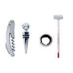 Елегантен комплект за вино, представен в дървена кутия. Със запушалка за вино, тирбушон, накрайник за бутилка и термометър.