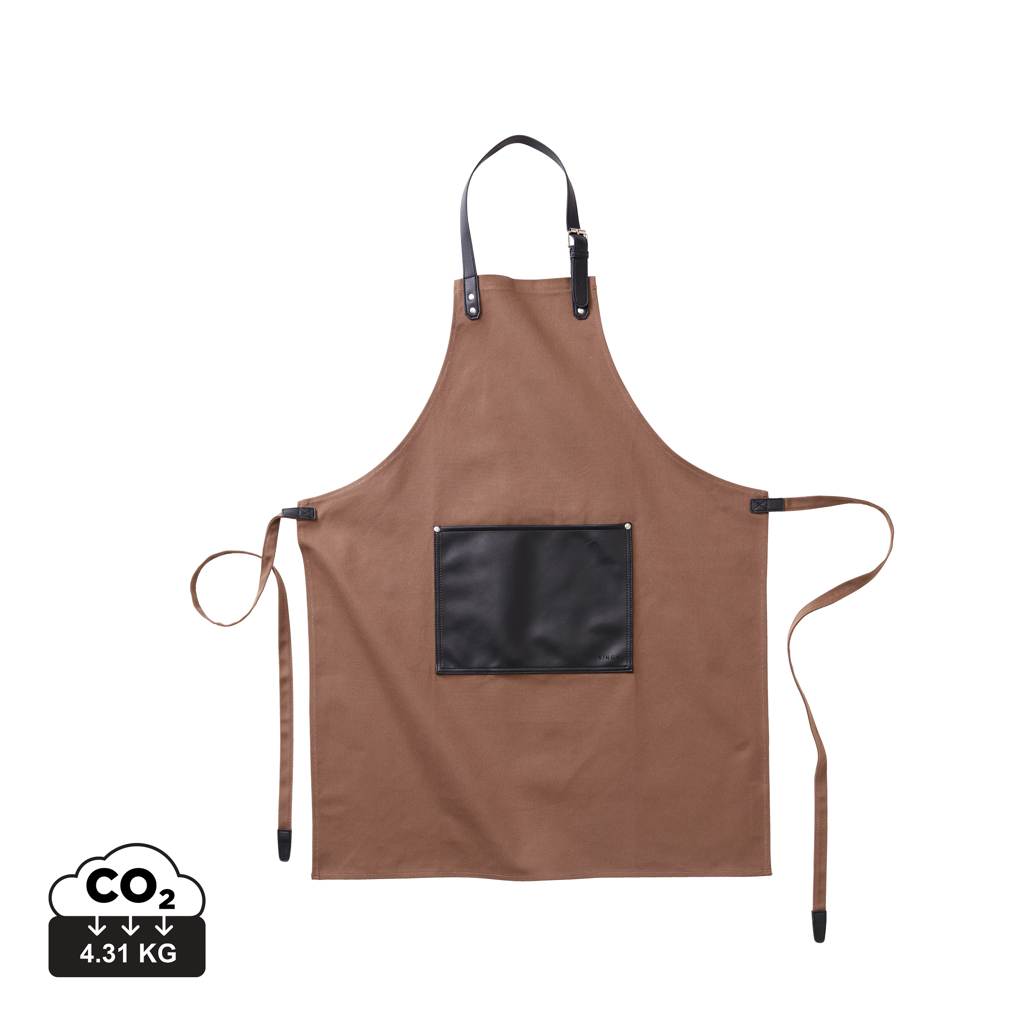 Стилна и класическа престилка от дебело памучно платно с дискретни детайли от веган кожа. Регулируемо закопчаване с катарама в горната част и голям джоб отпред. Престилка с дълъг живот, която става все по-красива с времето.