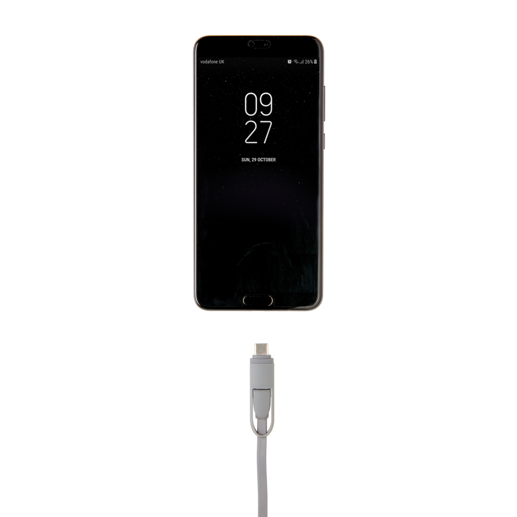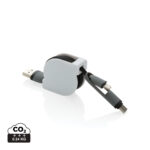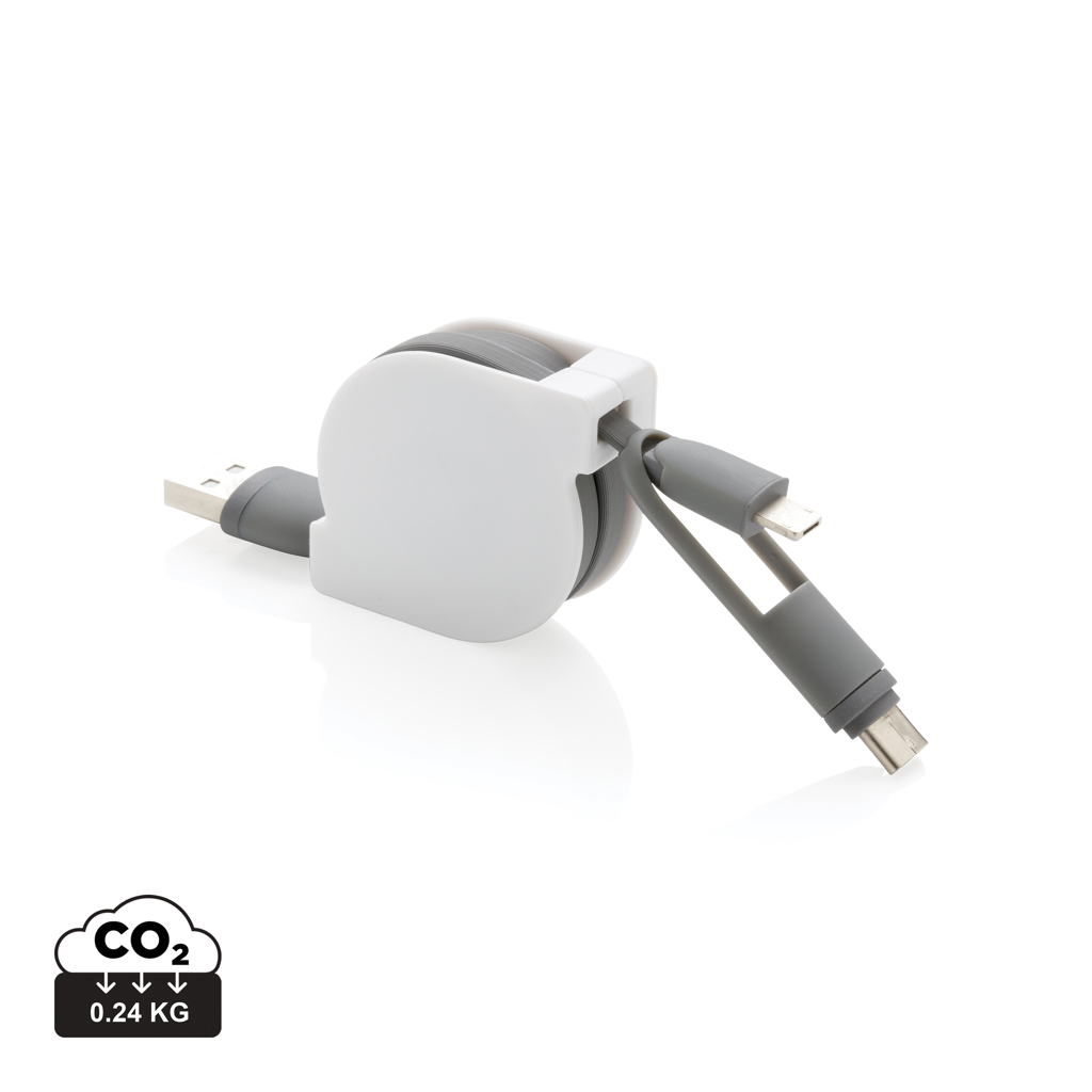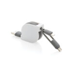 Компактен и прибиращ се кабел за зареждане 3 в 1 с тип C и двустранен конектор за IOS и Android устройства, които изискват micro usb. Благодарение на прибиращия се механизъм, 100 см дълъг плосък кабел може лесно да се носи навсякъде, без да се заплита. Корпус от ABS с кабел от TPU материал. Подходящ и за синхронизиране.