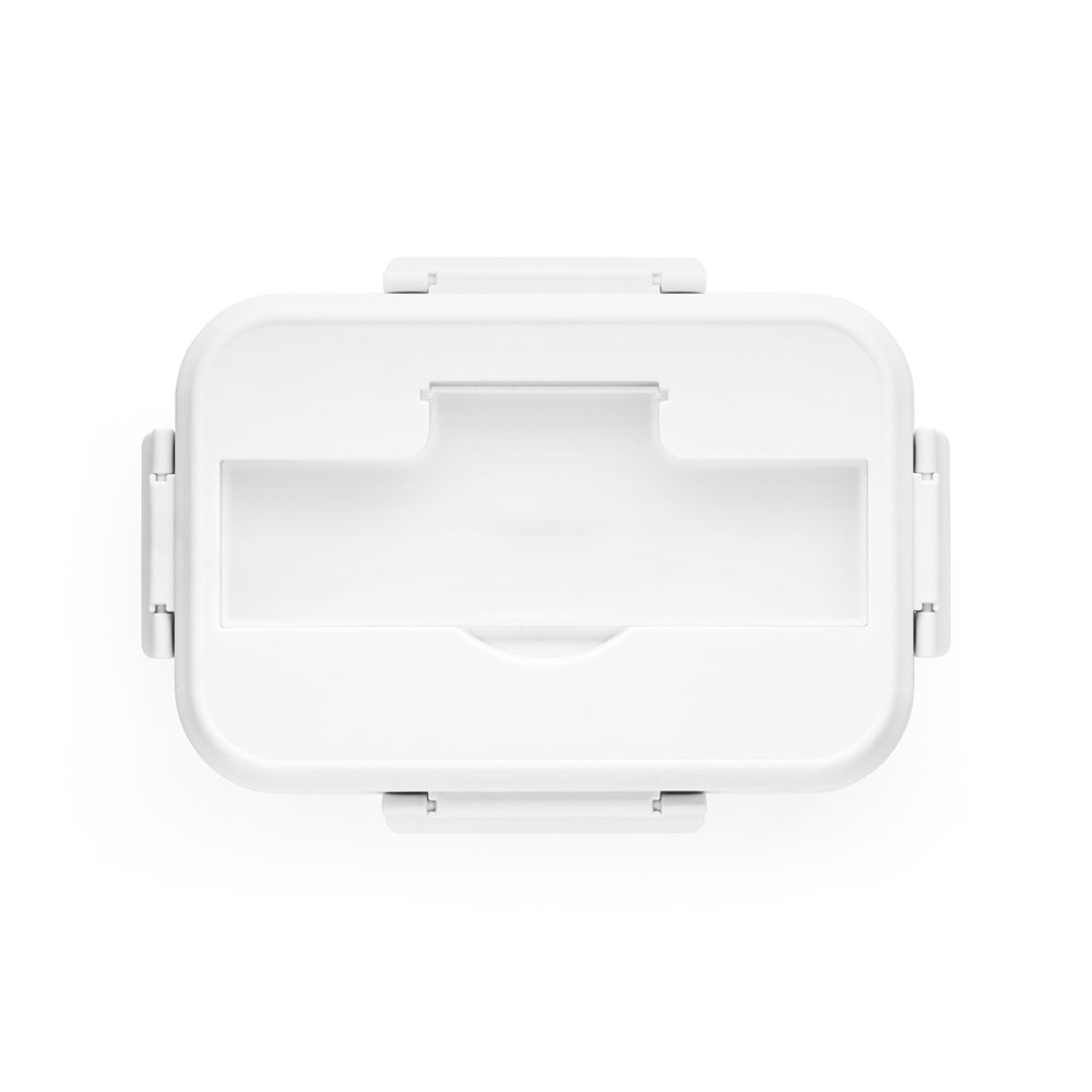 Херметична кутия от PP с вместимост до 1000 мл. Капакът има отделение за прибори (включени). Кутията е подходяща за микровълнова фурна, капакът трябва да се свали. Не се препоръчва за течности. 210 x 145 x 80 мм