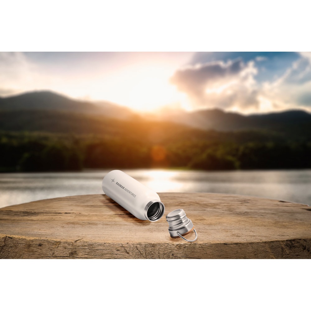 Вакуумна бутилка с неръждаема стомана с двойна стена и капацитет до 570 мл. Включва капак с винт с дръжка за носене от бамбук и неръждаема стомана. Доставя се в крафт подаръчна кутия. ø70 x 220 мм | 75 x 227 x 75 мм