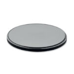 Алуминиево Безжично зарядно 10W със стъкло отгоре. Свържете устройството към вашия компютър, поставете смартфона върху него и го оставете да се зарежда. Синя светлина при зареждане. Изход: DC 9V/1.1A. Съвместими най-нови Android, iPhone® 8, X и по-нови.
