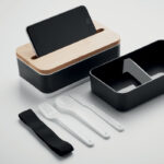 Кутия за обяд от рециклиран полипропилен на две нива с подвижна преграда и 3 прибора за хранене, бамбуков капак със закрепваща се полиестерна лента.