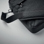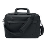 15-инчова чанта за лаптоп от 600D RPET полиестер. 2 основни вътрешни отделения за лаптоп и таблет и голям преден джоб с цип. Има малък джоб с цип. Подвижни и регулируеми презрамки. Държач за количка от обратната страна.