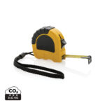 3-метрова ролетка, направена с RCS (Recycled Claim Standard) сертифициран рециклиран ABS. Общо рециклирано съдържание: 21% на базата на общото тегло на артикула. RCS сертификацията гарантира напълно сертифицирана верига за доставки на рециклирани материали. С луксозна TRP гумена ръкохватка за гладък захват. С бутон за освобождаване/заключване. С 16 мм едностранна ролетка, жълта с черна кука от въглеродна стомана. С полиестерна каишка за китка. Опаковани в FSC® микс крафт опаковка