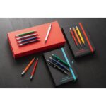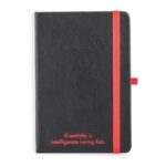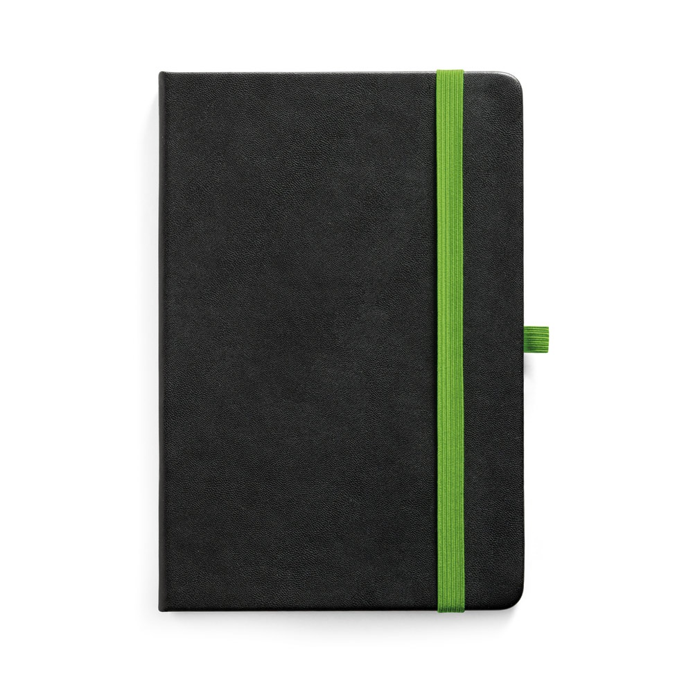 Тефтер A5 с твърда полиуретанова корица и 160 страници с редове. Тефтер с цветна подложка, позволяваща лазерно гравиране на цвета на ластика. Той има лента за отметки, вътрешен джоб и държач за химикалка (химикалката не е включена в комплекта). 140 х 210 мм