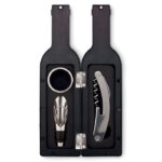 Комплект за вино, представен в кутия с форма на бутилка. Със запушалка за вино, тирбушон и яка против капене. Магнитно затваряне.