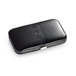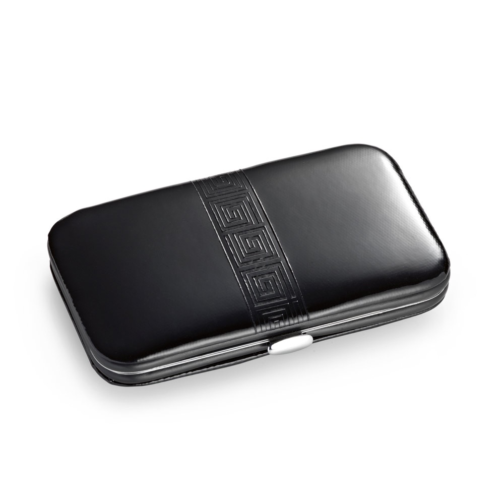 Комплект за маникюр от пет части с пила за нокти, ножица, нокторезачка, пинсета и щипка за кожички. Доставя се в полиуретанов калъф. 110 x 65 x 20 мм