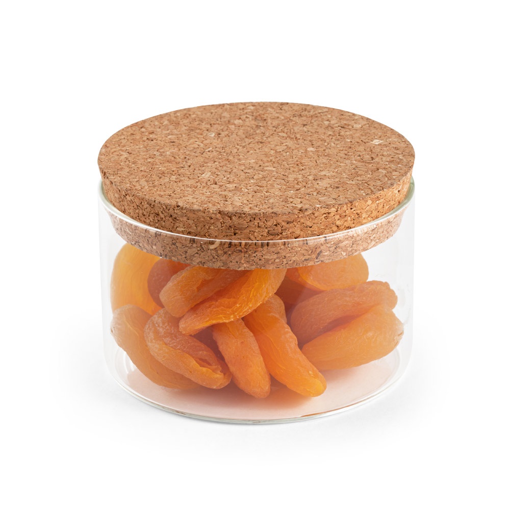 Бутилка от боросиликатно стъкло с корков капак. Вместимост до 380 мл. Доставя се в крафт кутия. ø95 x 60 мм