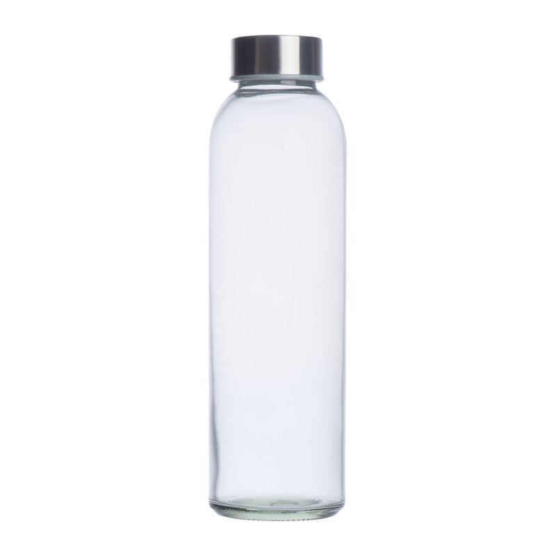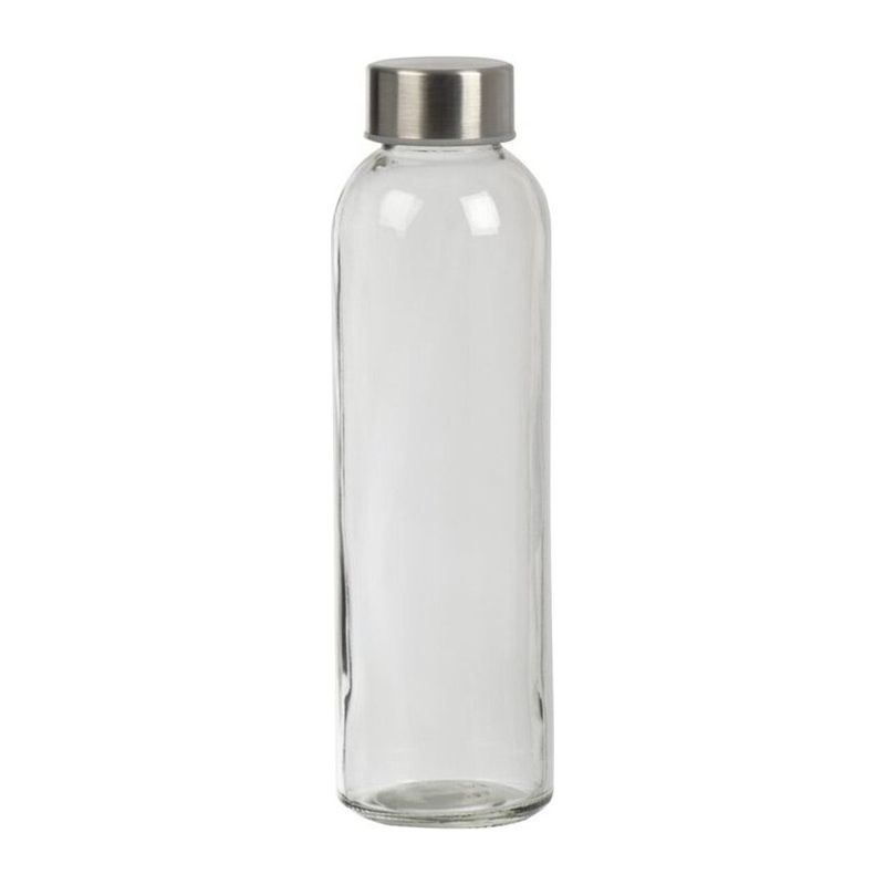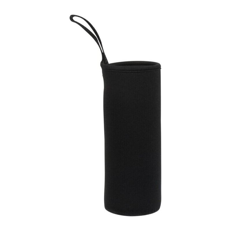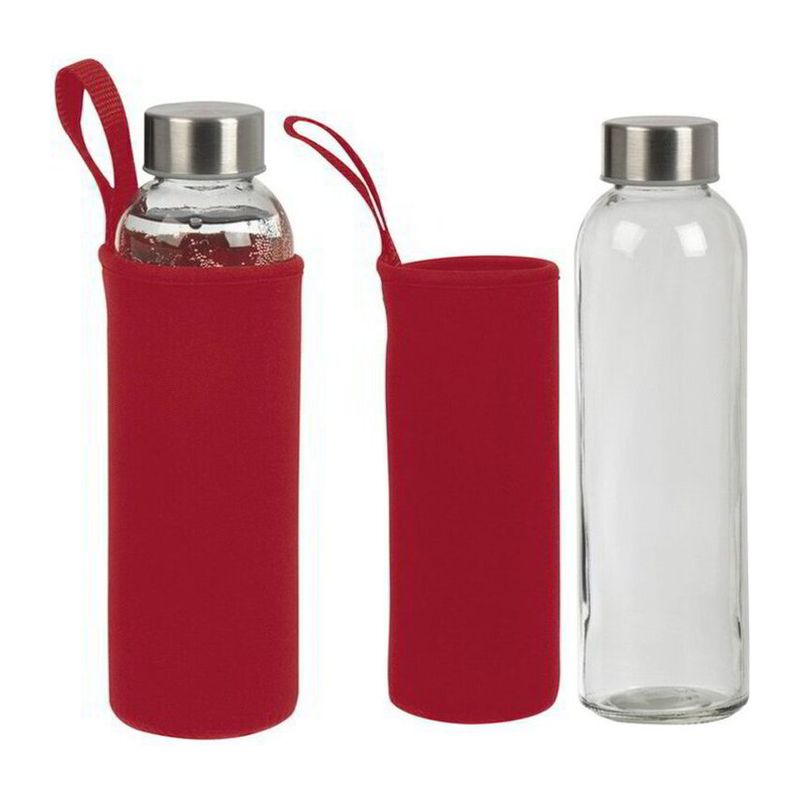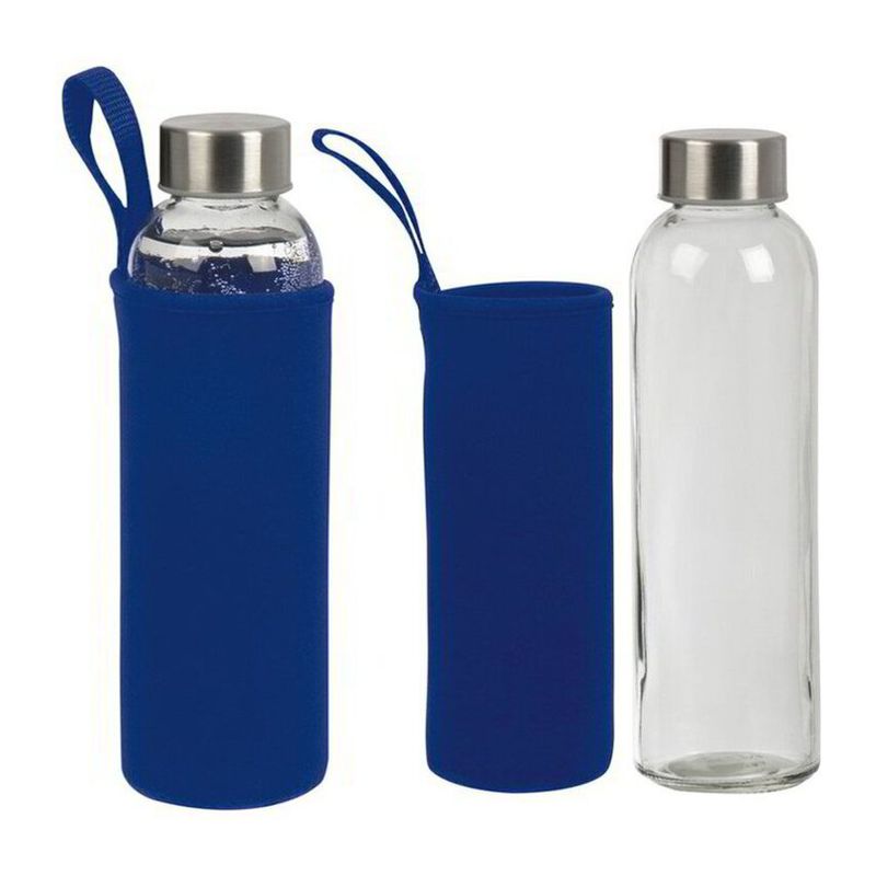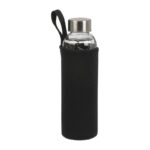 Стъклена бутилка за пиене в неопренова торбичка с ремък за носене и метален капак. Вместимост 500 мл.
