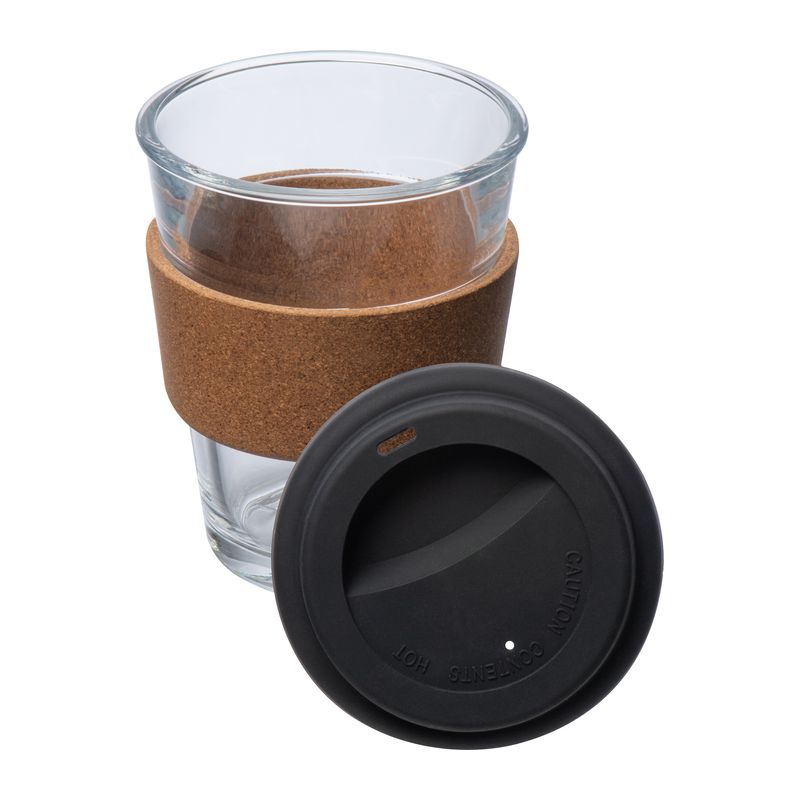 Чаша за пиене от стъкло със силиконов капак, коркова обвивка и вместимост 350 мл.