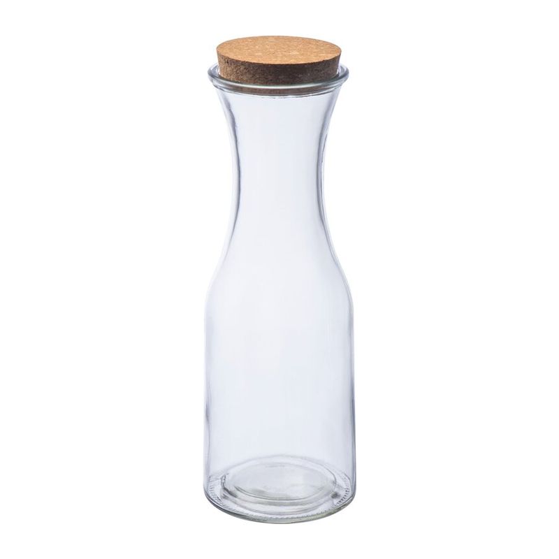Елегантна стъклена гарафа с корков капак и вместимост 1000 мл – стилно и практично решение за сервиране на вода, сокове или други напитки.
