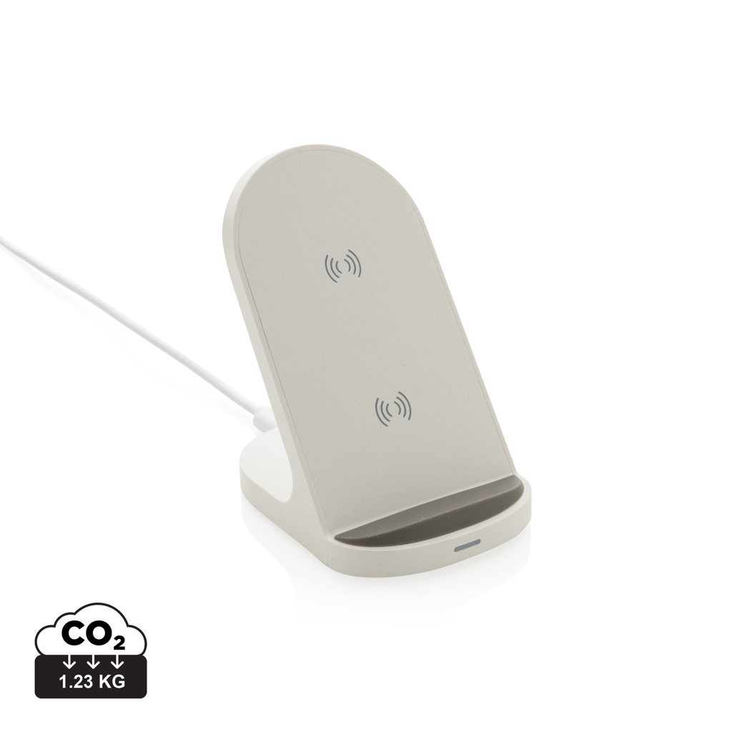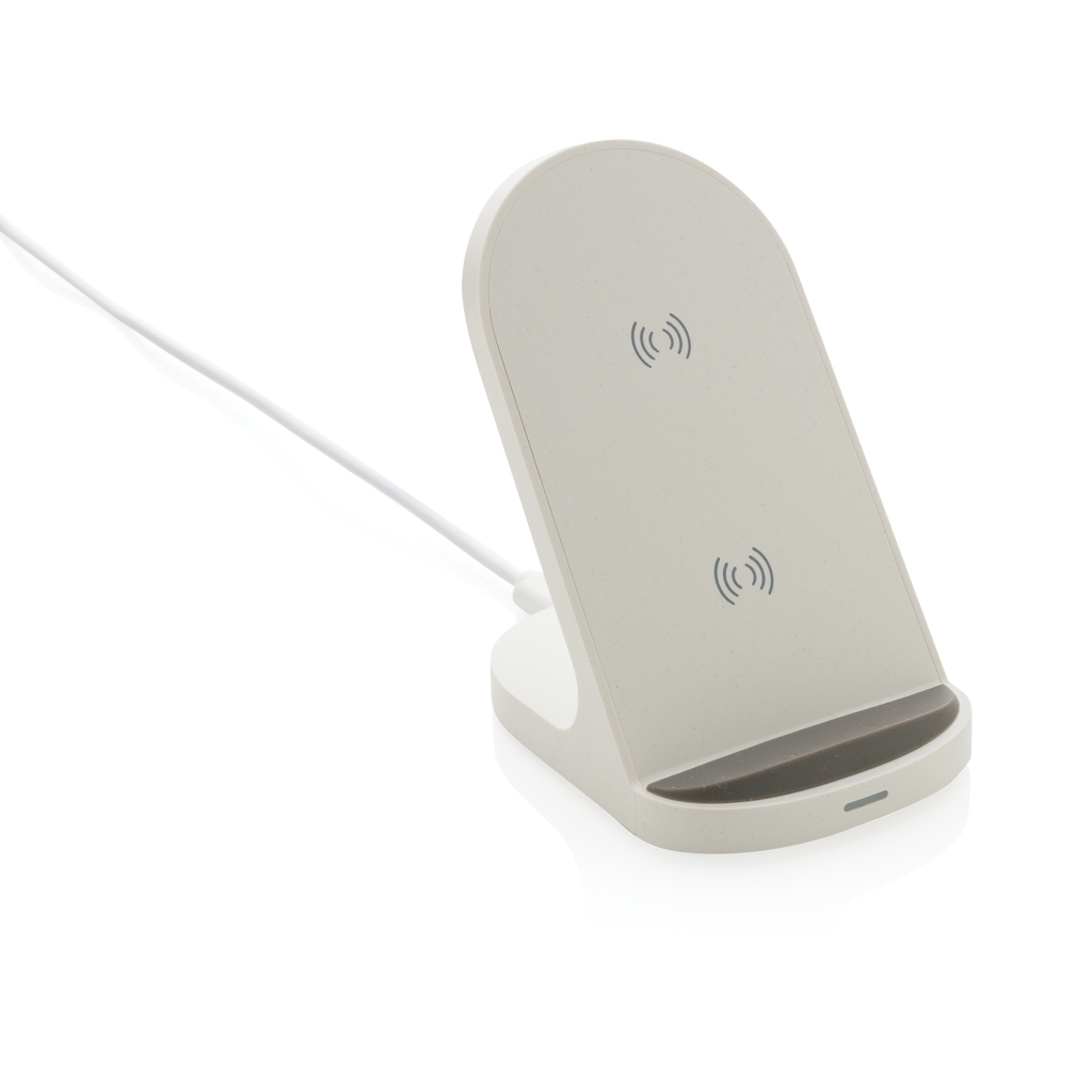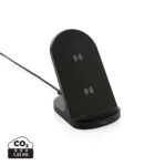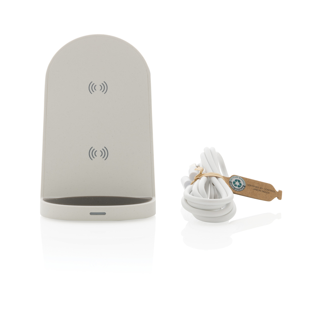 15 W безжична стойка за бързо зареждане с две интегрирани бобини за зареждане. Стойката поддържа както хоризонтално, така и вертикално зареждане. Изработено от сертифицирани рециклирани материали RCS (Recycled Claim Standard). Общо рециклирано съдържание: 56% на базата на общото тегло на артикула. RCS сертификацията гарантира напълно сертифицирана верига за доставки на рециклирани материали. Включва 150 cm кабел за зареждане от рециклиран TPE материал без PVC. ; Артикул и аксесоари 100% без PVC. Опаковани в FSC микс опаковка. Безжично зареждане, съвместимо с последните поколения Android, iPhone 8 и по-нови. Вход: 12V/1.67A. Безжичен изход: 9V/1.5A 15W.