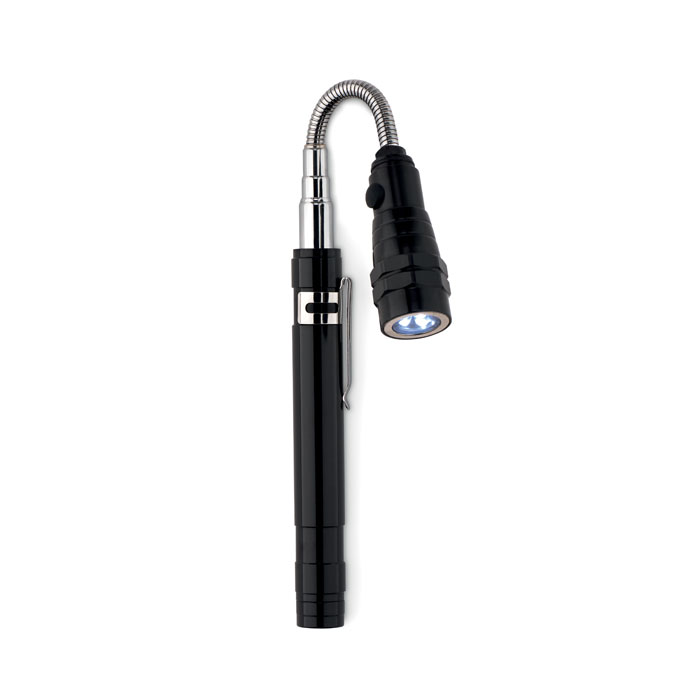 Разтегателен алуминиев фенер с 3 LED лампи и магнит отгоре и клипс отстрани. Включени 4 батерии LR44. Максимална дължина 57см.