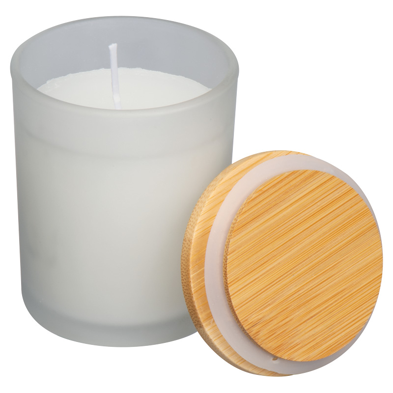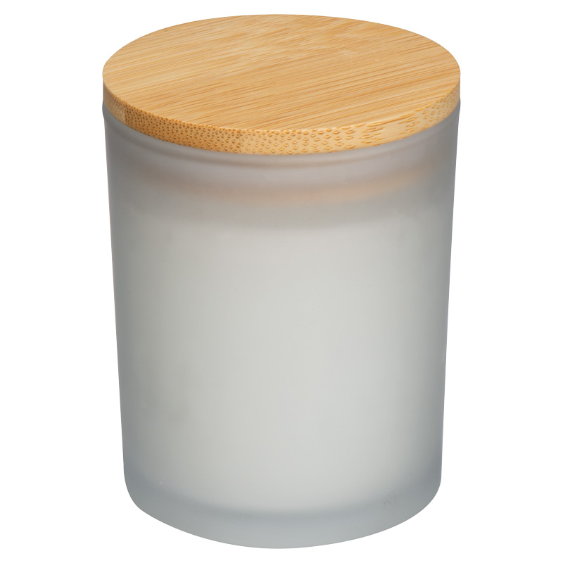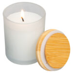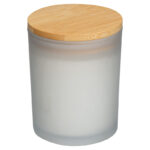Свещ в матирано стъкло с бамбуков капак съчетаваща елегантност и функционалност, което я прави идеален декоративен елемент за всяка стая.