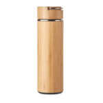 Двойна стена от неръждаема стомана/бамбук изолираща вакуумна колба с допълнителен инфузер за чай вътре. Вместимост: 400 мл. Без течове. Бамбукът е естествен продукт, възможно е да има леки вариации в цвета и размера на артикул, което може да повлияе на крайния резултат от декорацията.