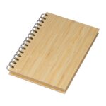 Шикозен еко комплект, състоящ се от тефтер DIN A5 с бамбукова корица, спирална подвързия и 160 редовани страници от рециклирана хартия, както и химикал от бамбук със син пластмасов пълнител и пластмасови апликации.