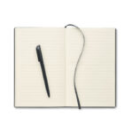 Бележник A5 със структурирана PU корица и ABS завъртяща се химикалка, интегрирана в гръбнака на тефтера. Калъфът е подвързан. Тефтерът съдържа 160 редовани страници от рециклирана хартия (80 листа).