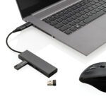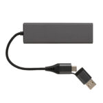 Алуминиев USB хъб, направен с RCS (Recycled Claim Standard) сертифициран рециклиран алуминий, ABS, TPE и PET. С 3 USB A 2.0 порта и 1 тип C порт. HUB има интегриран 10 см кабел, изработен от рециклиран RCS сертифициран TPE/PET материал. Общо рециклирано съдържание: 75% на базата на общото тегло на артикула. RCS сертификацията гарантира напълно сертифицирана верига за доставки на рециклирани материали. С двоен входен конектор, така че е подходящ както за компютри тип C, така и за USB A. Алуминият не губи своите характеристики в процеса на рециклиране и може да се рециклира безкрайно. Артикул и аксесоари 100% без PVC. Опаковани в FSC микс опаковка.