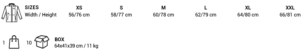 Отвън: 240 г/м² – 100% полиестер pongee 240 и водоустойчиво PVC покритие, вътрешност: 65 г/м² 100% полиестер тафта, пълнеж: 100% полиестер г/м².