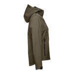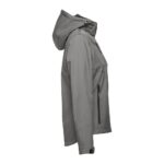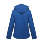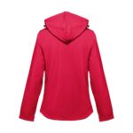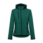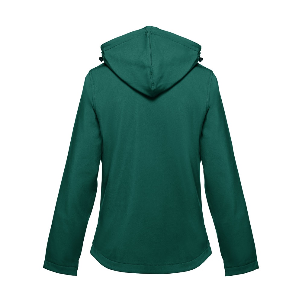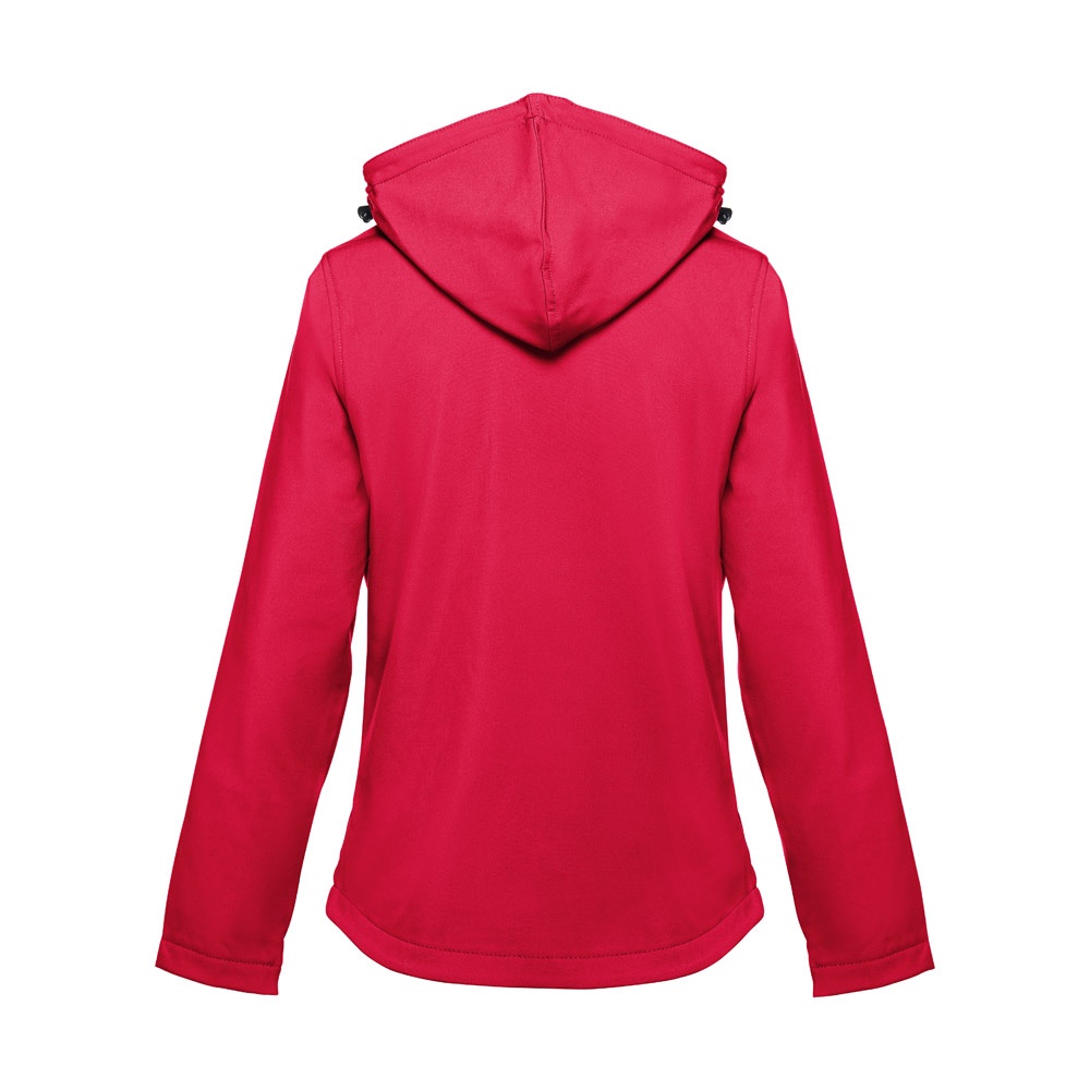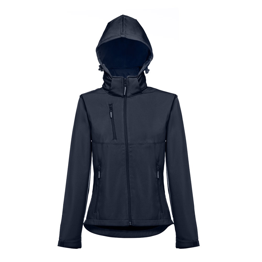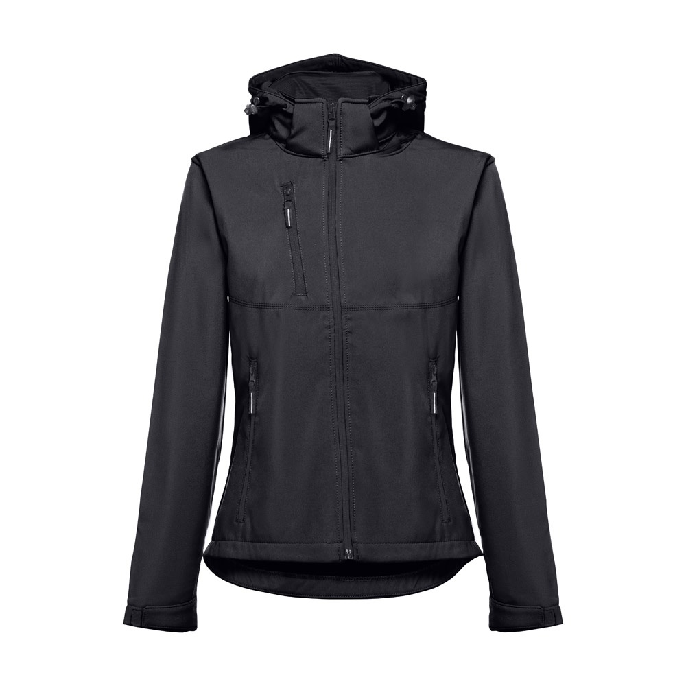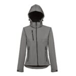 Дамско софтшел яке от 96% полиестер и 4% еластан – 280 г/м², с два слоя, подвижна качулка и водоустойчиво покритие.