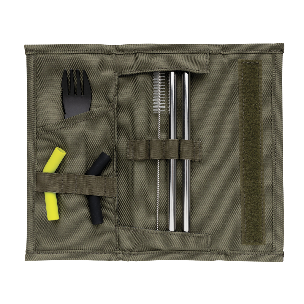 Комплектът сламка и прибори за хранене Tierra 2 е идеалният комплект, който да вземете със себе си в движение, когато искате да намалите употребата на пластмаса за еднократна употреба. Комплектът съдържа 2 сламки от неръждаема стомана, четка за почистване, щифт и 2 огънати части от силиконова сламка за прикрепване към правата ss сламка за оптимален комфорт, докато отпивате от напитката си. Двата различни цвята ви улесняват да ги различавате. Опакован в удобна торбичка с велкро закопчаване. Може да се мие в съдомиялна машина. Отвън 100% 600D полиестер, отвътре 100% 210D полиестер. Без PVC.