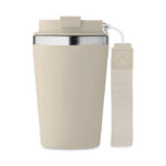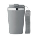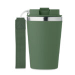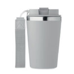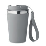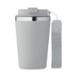 Чаша с двойна стена от рециклирана неръждаема стомана (90% рециклирана неръждаема стомана и 10% неръждаема стомана) с рециклиран PP външен слой с RPET каишка за китка. Без течове. Вместимост: 350 мл.
